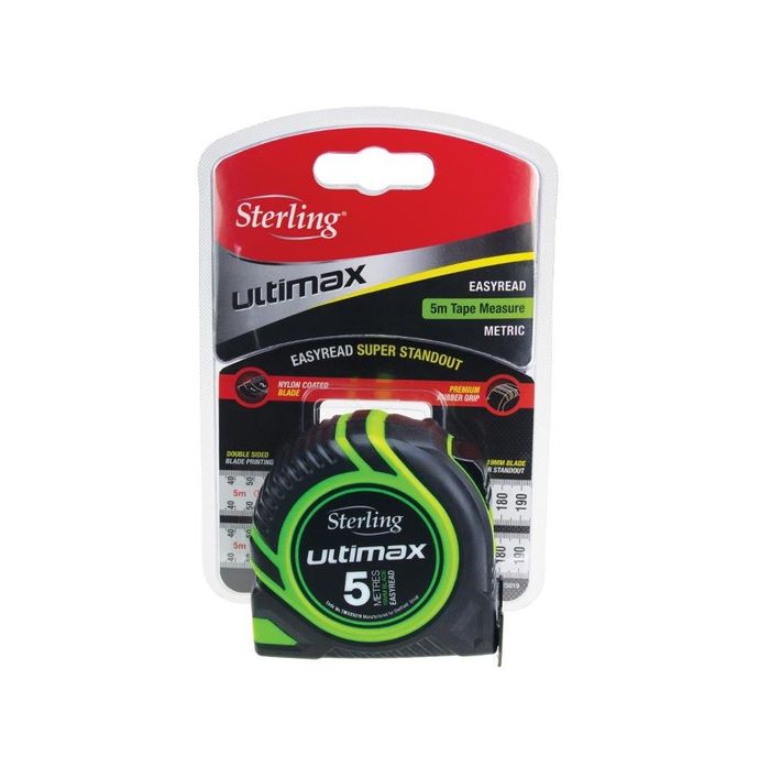 Sterlings Ultimax Pro Easyread has been developed for optimised readability. The double-sided, white, printed blade features vertical measurement markings for ease of use and improved distance reading. These markings are quickly becoming a must-have amongst tradesmen.