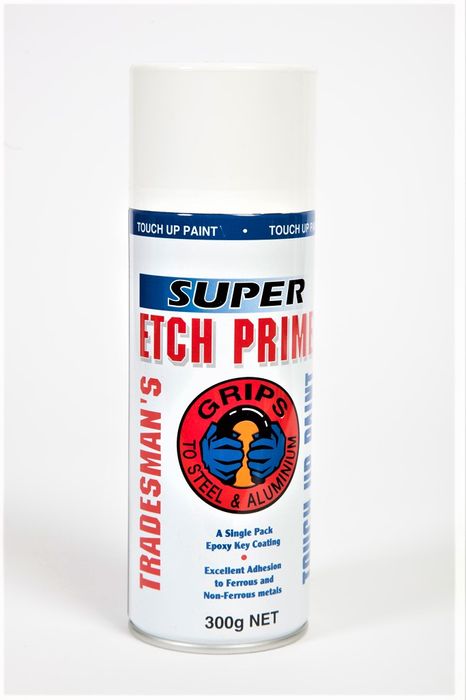 Spray Etch Primer is a preparatory coating specifically formulated for use on metals. It works by acid ecthing the metal surface. Etch Primer uses a mixture of phosphoric acid and zinc chemicals to micro-etch the metal surface it is applied to, which promotes adhesion for the coming layers, and also provides a layer of corrosion resistance to the metal.